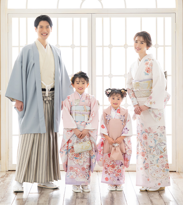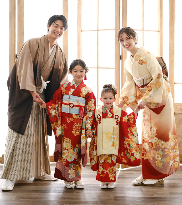 特別な日には特別な装いを! 家族みんなで着物のリンクコーデに挑戦してみませんか? 洋服を選ぶように着物を選ぶ時間もお楽しみください。 迷ったときにはスタッフがアドバイスするのでご安心を! もちろん着付けやヘアメイクもお任せください。
